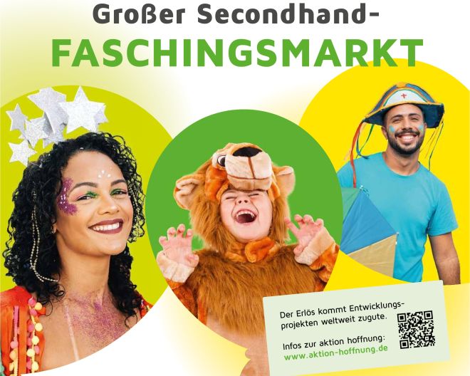 Pfarrheim Maria unterm Kreuz Kemptener Str. 99, Königsbrunn, DeutschlandBeim Secondhand-Faschingsmarkt zugunsten eines Entwicklungshilfeprojekts in Indien gibt es eine bunte Auswahl an Kostümen und Accessoires für Groß und Klein. Ein besonderes Highlight ist der Auftritt der Jugend-Showtanzgruppe Narrneusia mit ihrer Show „Sonne, Mond und Sterne“.