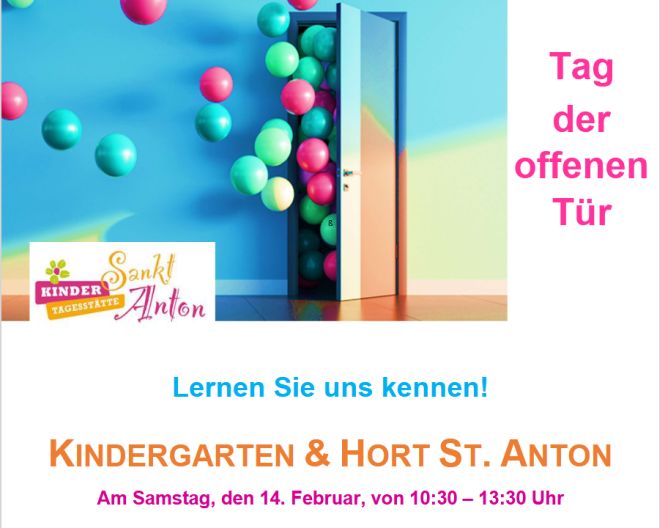 Wir laden interessierte Eltern künftiger Kindergarten- und Hortkinder zum Tag der offenen Tür ein. Sie lernen das Team kennen, erhalten Einblick in das pädagogische Konzept und können sich mit dem Elternbeirat bei Kaffee und Kuchen austauschen.